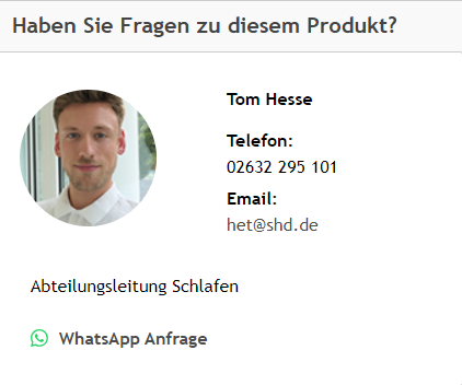 Mit dieser Shop Erweiterung lassen sich mehrere Ansprechpartner für verschiedene Storebereiche anlegen und im Frontend anzeigen. Dem Ansprechpartner kann ein Titel und alle nötige Kontaktdaten zugewiesen werden. Das Plugin wird auf der Produktdetailseite dargestellt.