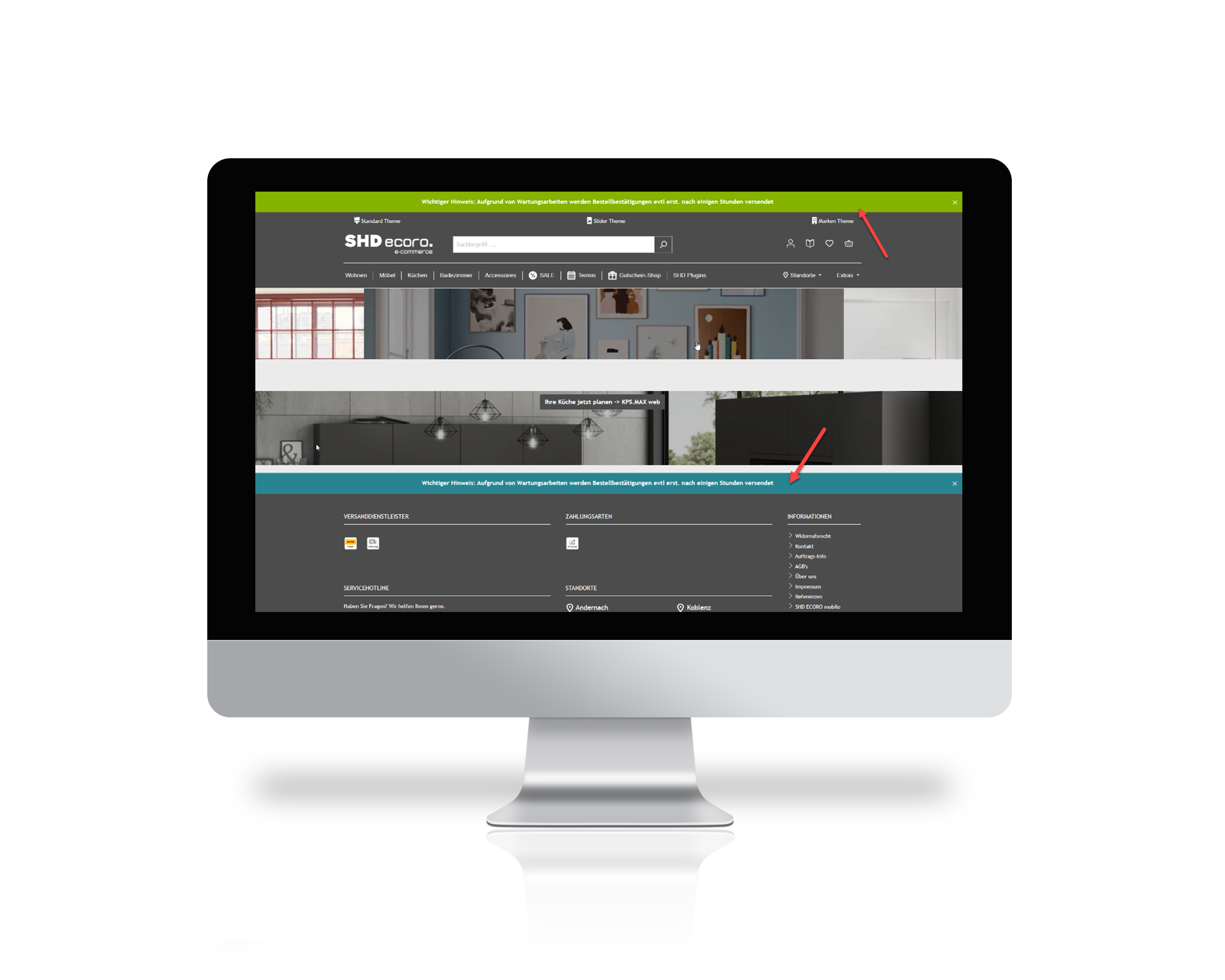 Mithilfe des Informationsbanners erhält der Benutzer die Option, seine Besucher über kommende Aktionen auf der Website zu benachrichtigen. Mit dem Header-Info-Banner wird die Leiste am oberen Rand der Webseite eingeblendet, während der Footer-Info-Banner am unteren Rand der Webseite erscheint.